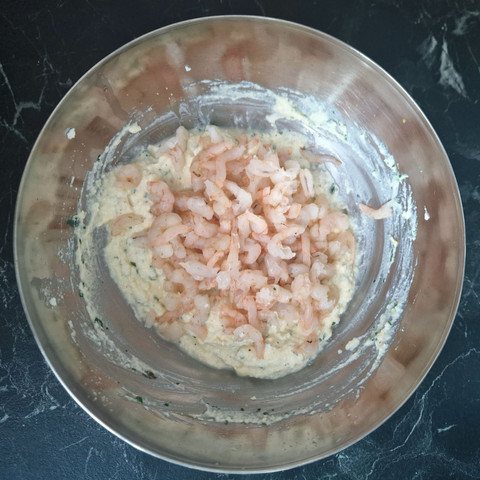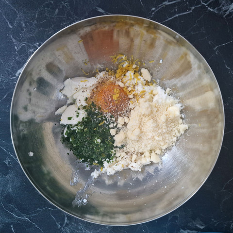 Mescolate bene la ricotta insieme ai gamberetti, l'uovo, la scorza del limone grattugiata, sale, pepe, prezzemolo e parmigiano